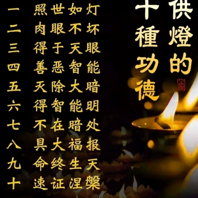 光明的前途,般若的智能,平安的日子,幸福的生活,谐和的家庭、安宁的社会、和平的世界,不是上帝创造的,其圆成与破坏都操之在众生自己。一人施灯供佛,一人受惠;一家施灯供佛,一家受惠;人人施灯供佛,人人受福;家家施灯供佛,家家受福。只要有灯明的地方,诸佛菩萨的慈光自然遍照。佛子们!你一灯,我一灯,让我们一齐在佛前普点平安灯!你增福,我增福;你增慧,我增慧;让平安灯照遍众生,照遍环宇吧!