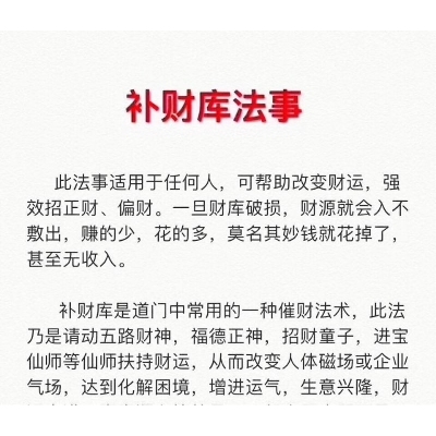 每个人在地府都有一个财库,这个财库与一个人的福禄,财运有关。我们每天衣食住行都是从自己的财库里取用,若取用无度而不懂得往财库里注入新的财富,则一旦财库亏空或者漏底,就会遭遇到贫、困甚至灾难。所以补财库不是一定要无财的时候再进行相关的法事,我们需要在财库中尚有余额之时就进行法事补财来做功德积累,如此,才不至于福尽财终,和越来越有财富/财运