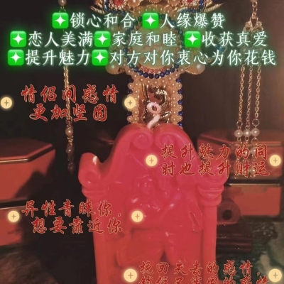 等给予我们好人缘,增魅力,旺财气,遇贵人增添人气吸引力,爱情婚缘运。黛莱美满的人缘磁场受人喜爱和尊敬。提升人员,增加财源能量。让对方思念你,满的正能量,思考清晰,做事利落。让另一半更关心自己,让感情升温,强力旺,异性缘,让对方思念你,魂不守舍,对你百依百顺,没有一心锁住他的心,感情和睦,归心似箭,为你付出花钱。提升强大的人格魅力,让你人见人爱,使得身边的异性都为你着迷,称为掌上明珠,为你倾倒。提升,超强的魅力,吸引众人目光。令对方迷幻陶醉,听令于你。长期点燃更能减轻感情中的压力,开发你的智慧,增强记忆,提升第六感,让人常常不由自主的想起你,获得真正的感情与财富
