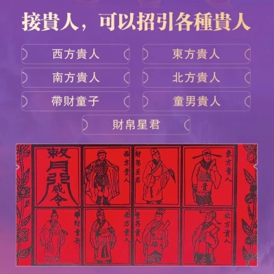 接贵人就是招引各种贵人,包括西方贵人、东方贵人、 南方贵人、 北方贵人、带财童子、 童男贵人、 财帛星君。