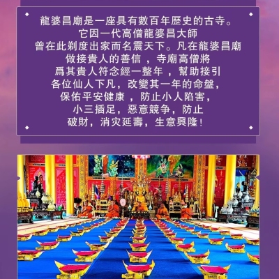 龙婆昌庙是一座具有数百年历史的古寺。 它因一代高僧龙婆昌大师曾在此剃度出家而名震天下。 凡在龙婆昌庙做接贵人的善信 ,寺庙高僧将为其贵人符念经一整年 ,帮助接引各位仙人下凡,改变其一年的命盘,保佑平安健康 ,防止小人陷害,小三插足,恶意竞争,防止破财,消灾延寿,生意兴隆!