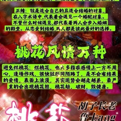 避免烂桃花:烂桃花,也主要是指在感情上不用一方心,逢场作戏,很快就形同陌路了,是不会有结果的爱情,表面上浪漫,其实运势会越走越差,最严重的会出现桃花煞、桃花劫、破财、毁健康。