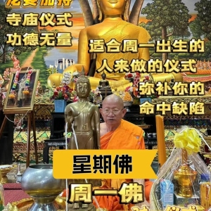 一周7天每天出生的人,都会有一些命中注定哦的不足,还有一些运势,因为每天出生的人运气是不同的,所以星期佛是最适合弥补,你自己这一天出生需要弥补的运气!而且每个人的性格与命运也与出生当天的生日息息相关,就像西方的星座,泰国人特别在乎星期几出生,因为一周七天有不同的守护神,选择自己的守护神,去做仪式